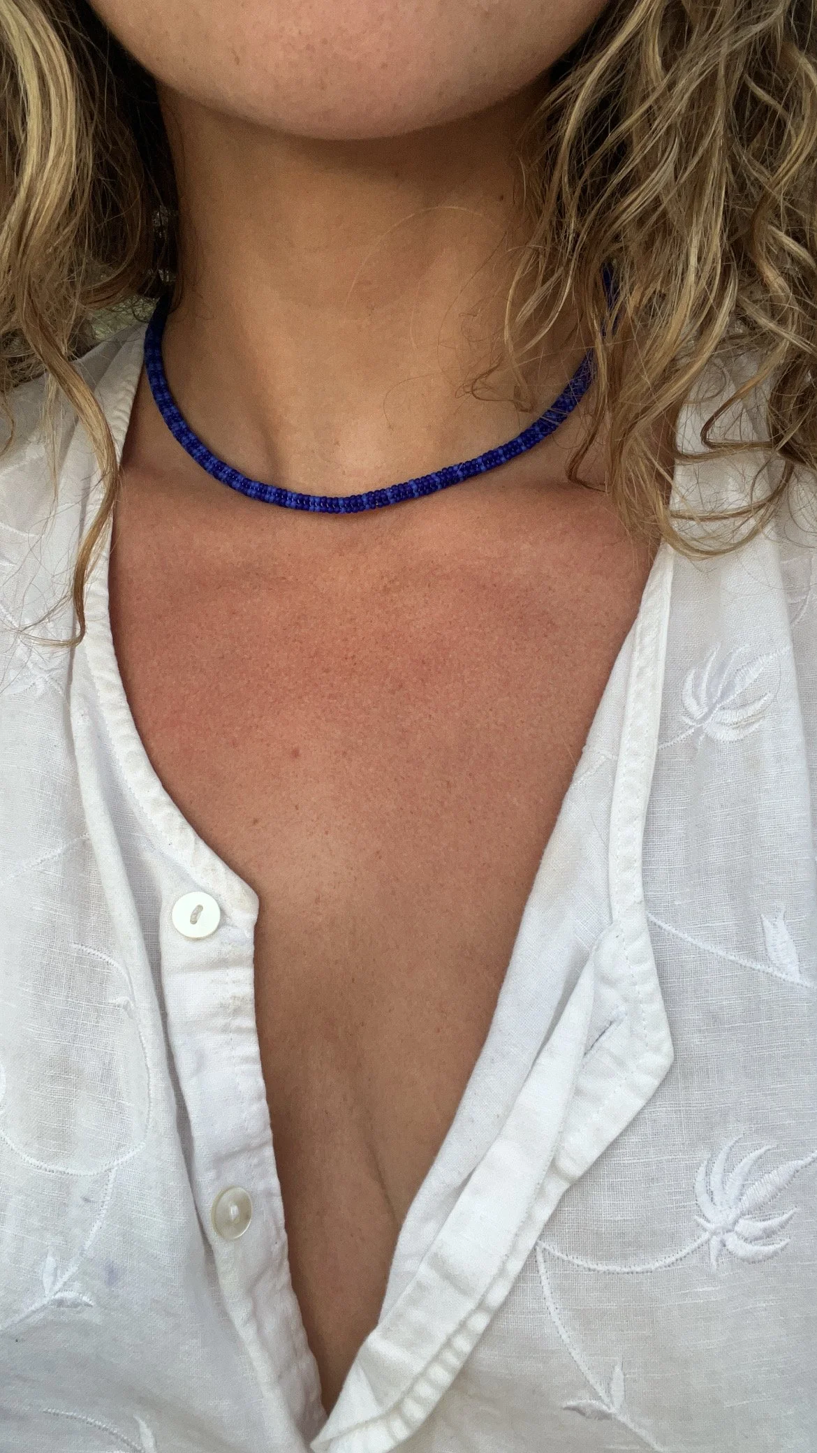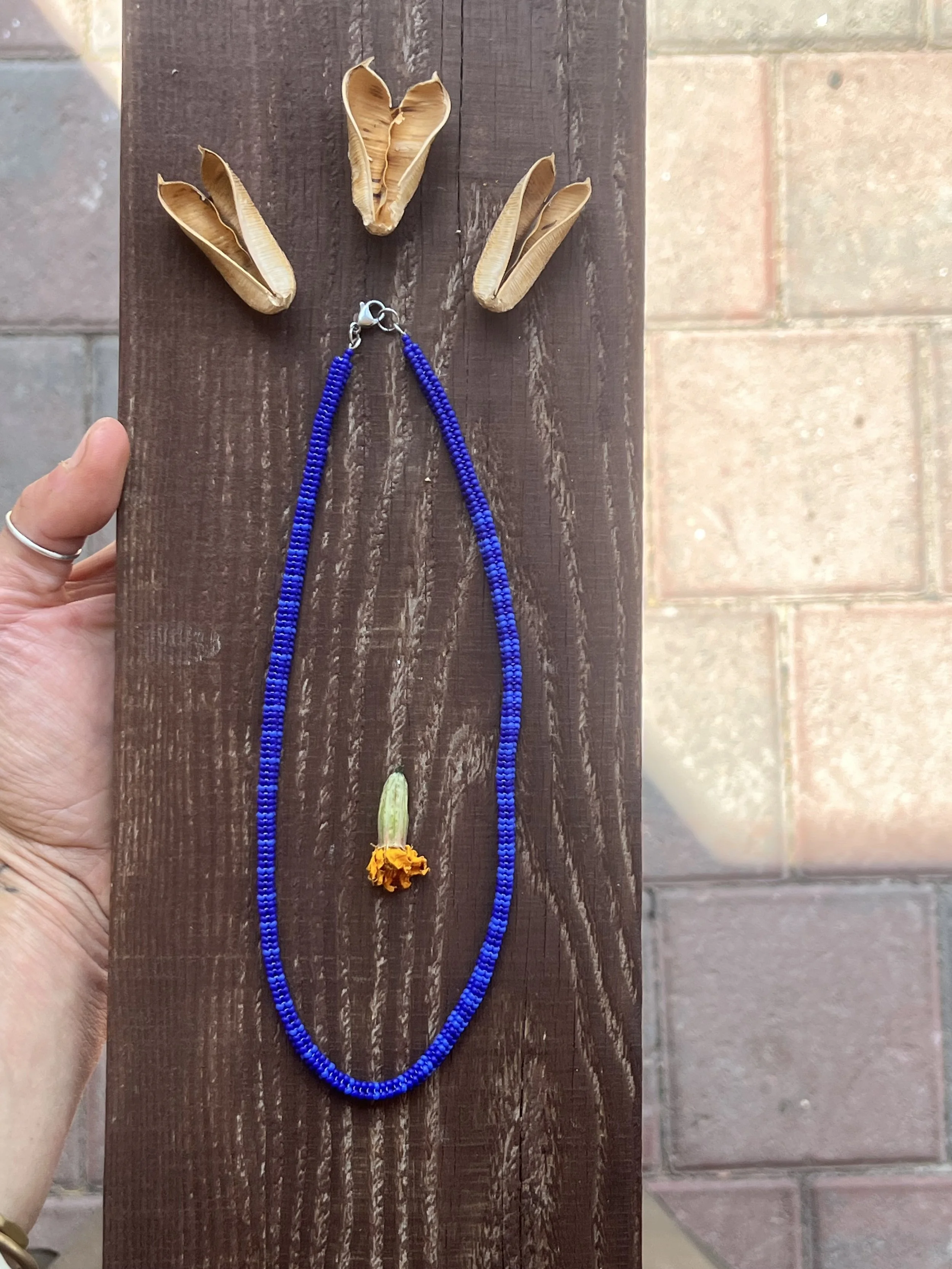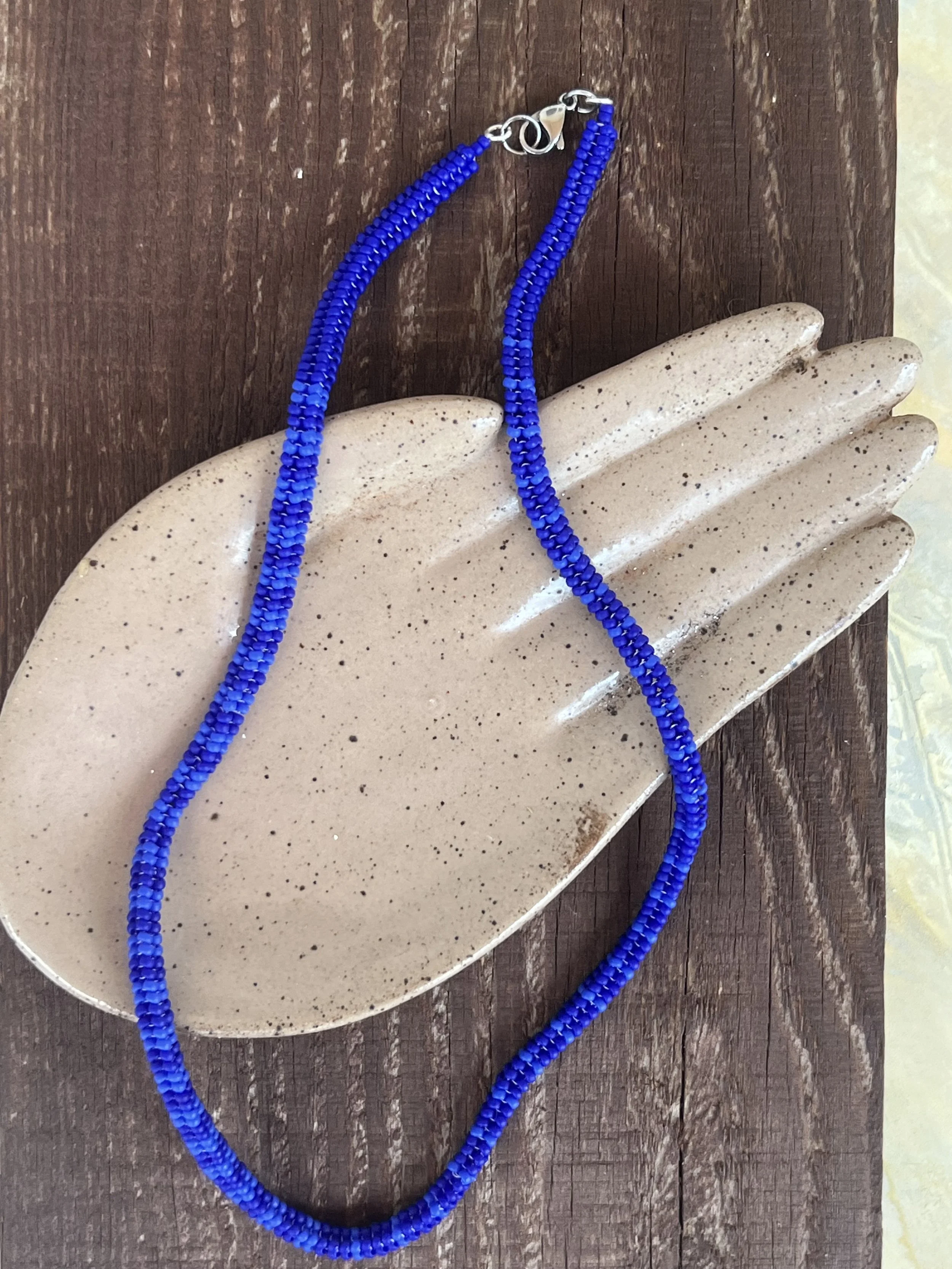 Four sided woven necklace made with glass seed beads & stailnless steel finish/clasp.