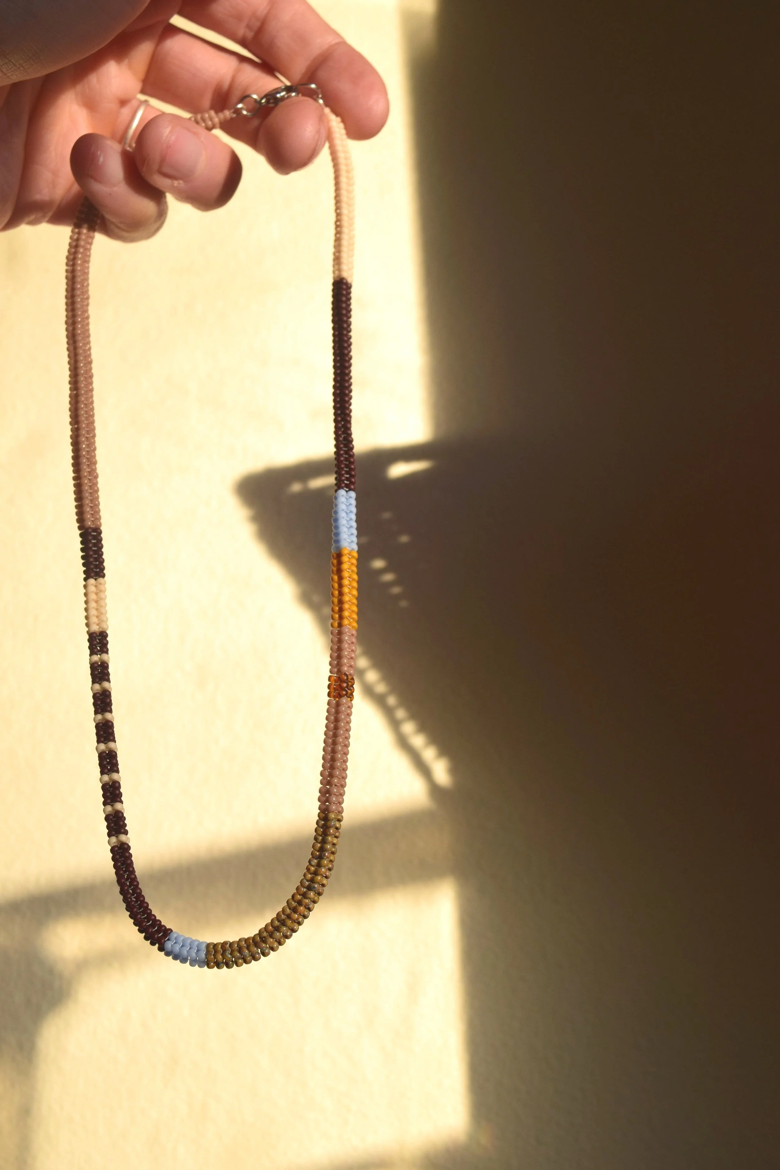 Four sided woven necklace made with glass seed beads & sterling silver finish/clasp.
