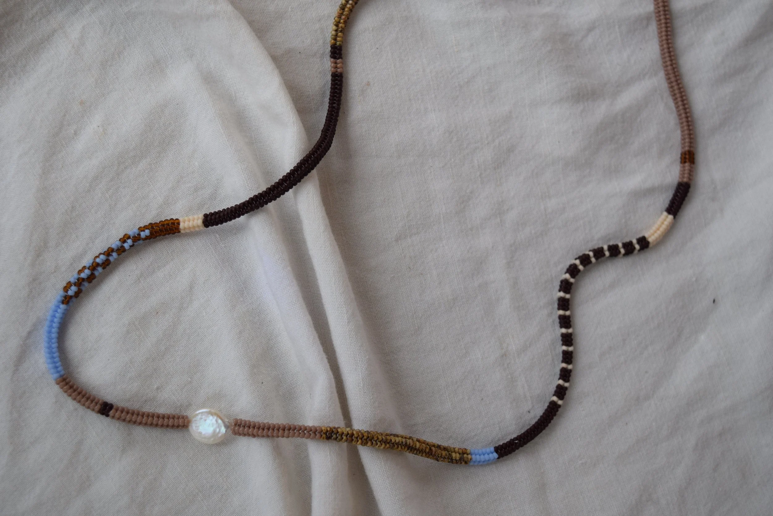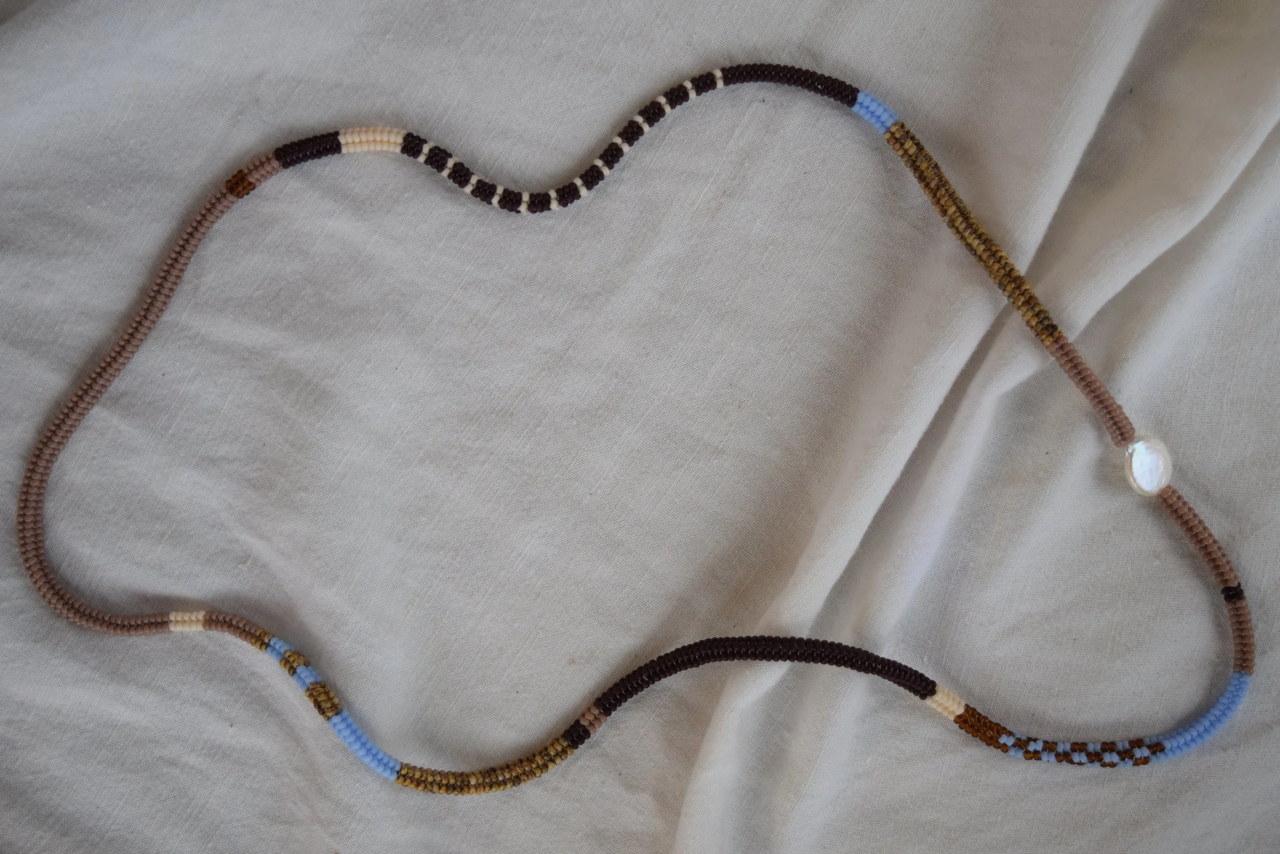 four sided endless woven necklace made with glass seed beads and large pearl bead