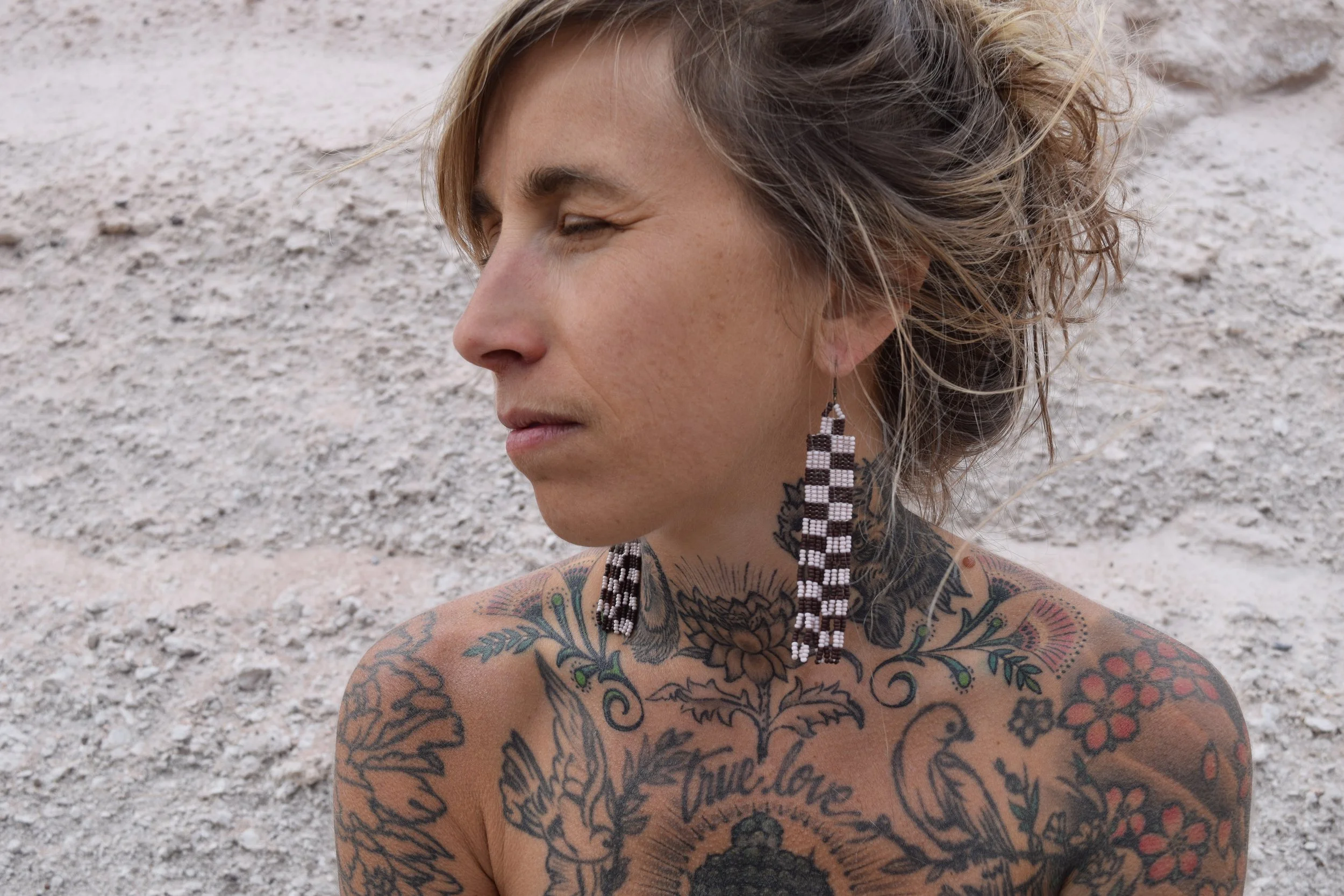 woven and threaded dangler earrings made with glass seed beads & stainless steel thread guard +stainless steel earring hook