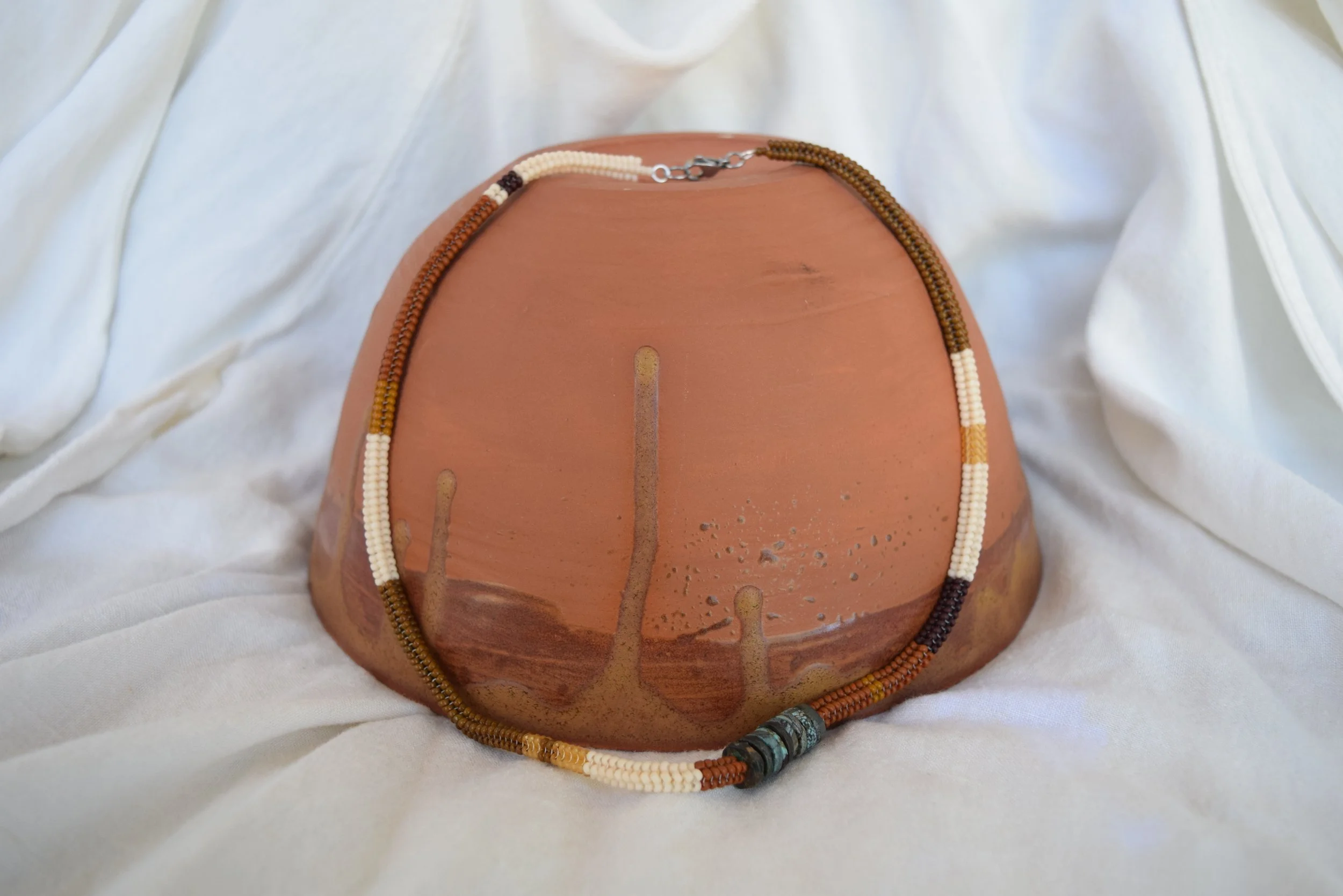 Four sided woven necklace made with glass seed beads and stainless steel finish+clasp.